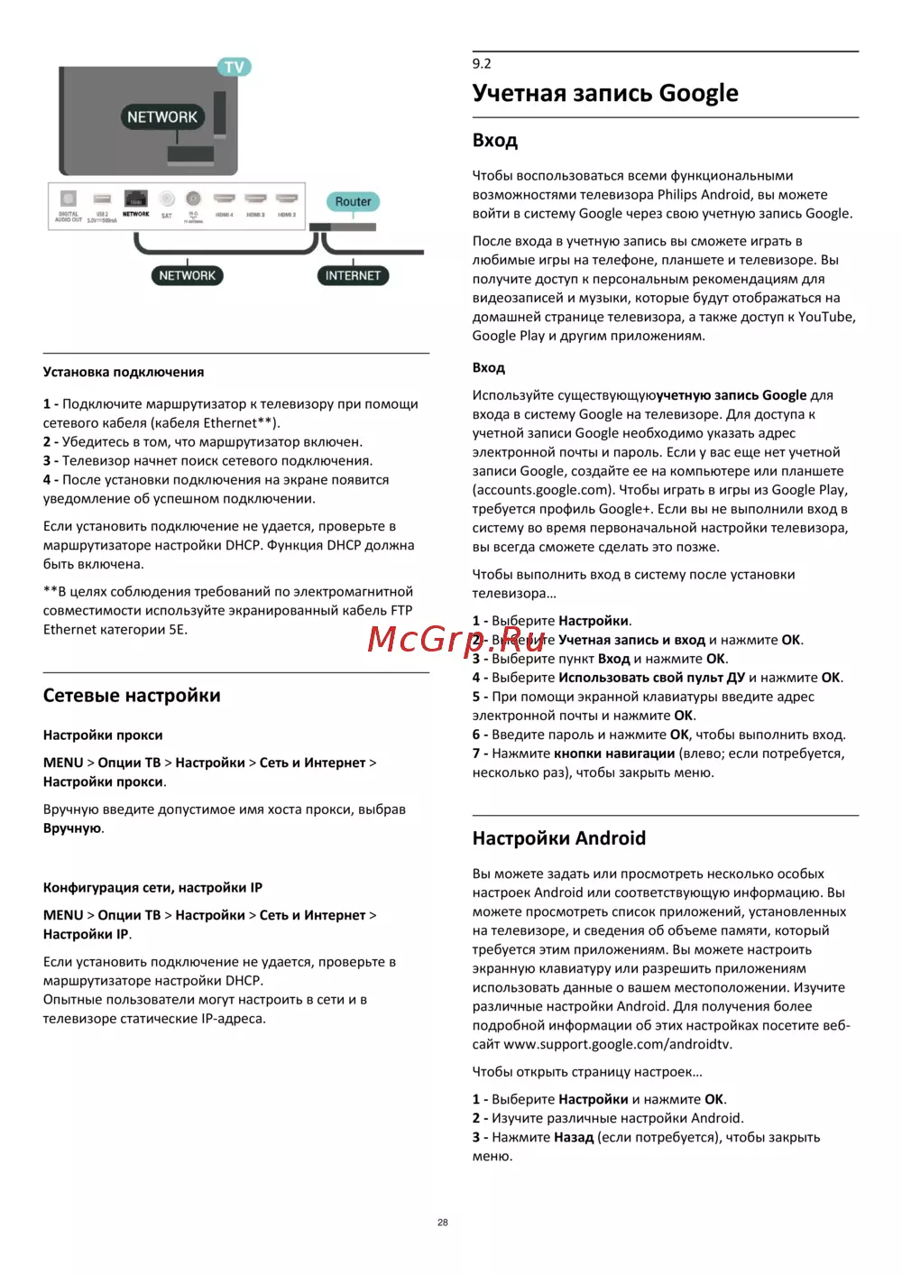 MENU > Опции ТВ > Настройки > Сеть и Интернет >