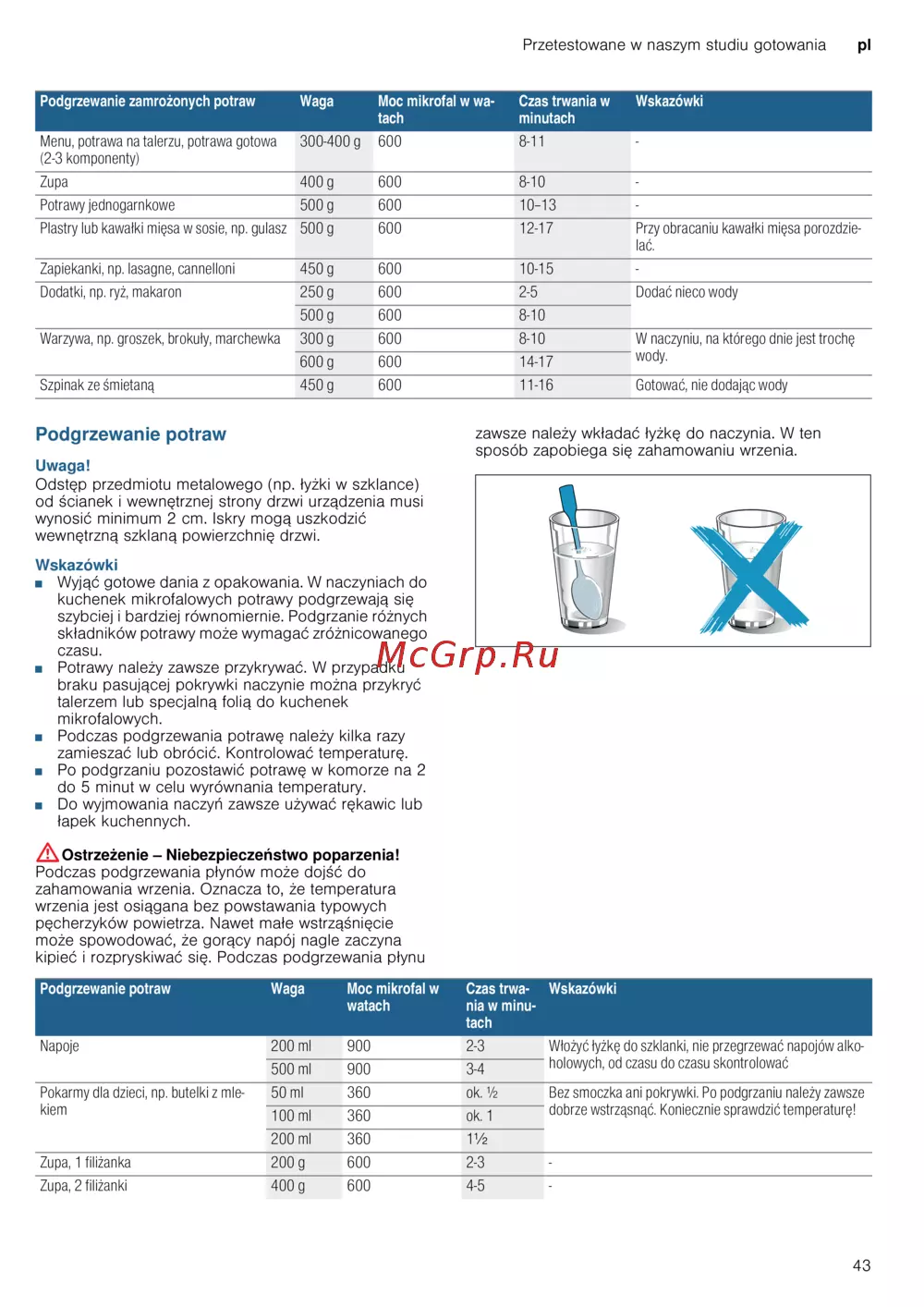 Podgrzewanie zamrożonych potraw Waga Moc mikrofal w wa-