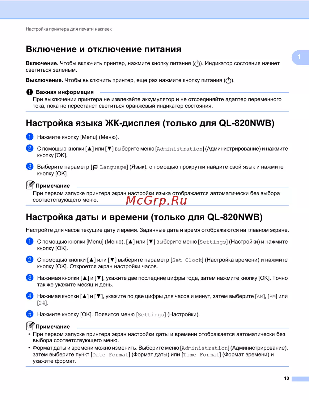 - Настройка языка жк дисплея только для ql 820nwb p.20