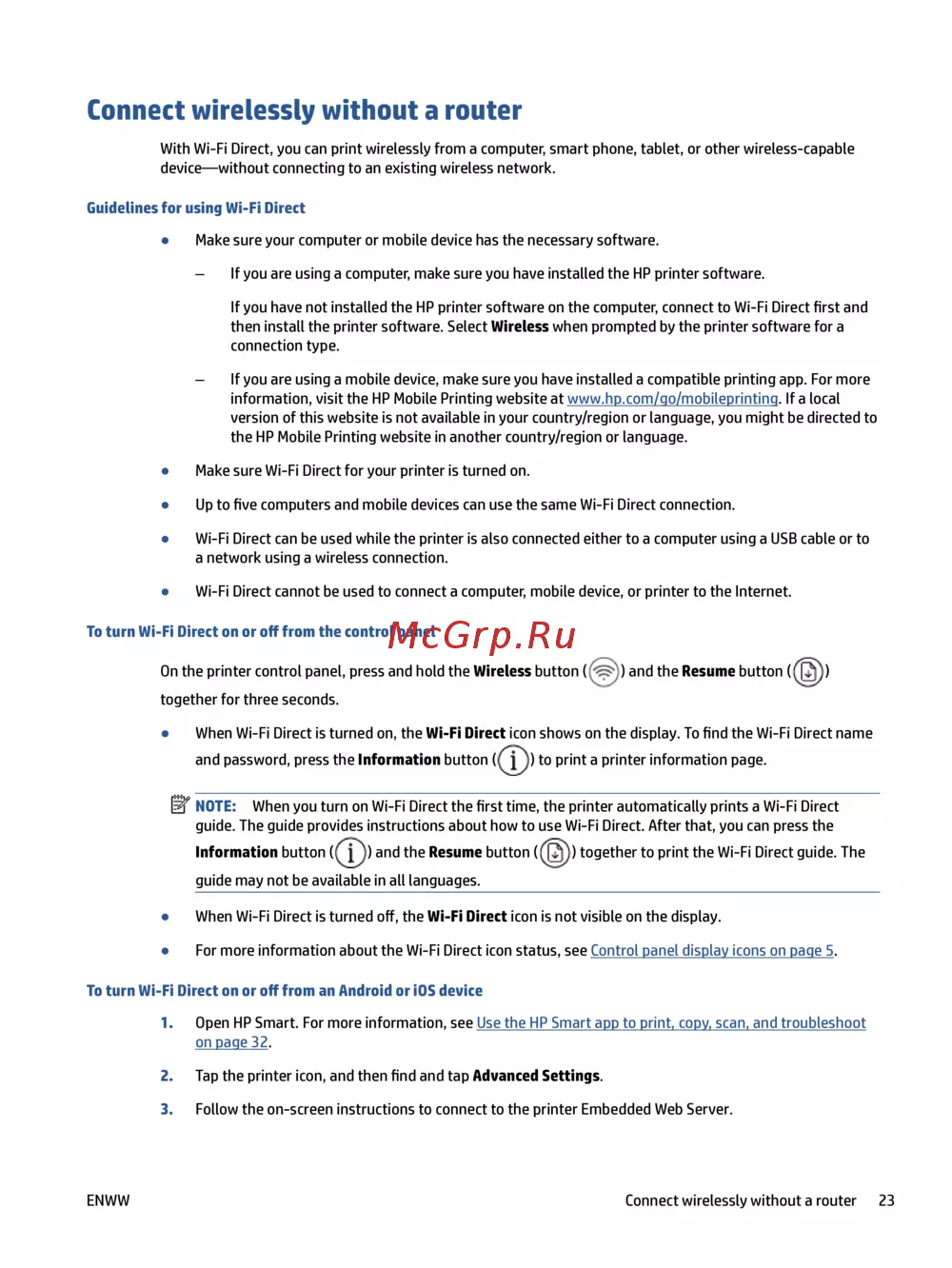 NOTE: When you turn on Wi-Fi Direct the rst time, the printer automatically prints a Wi-Fi Direct