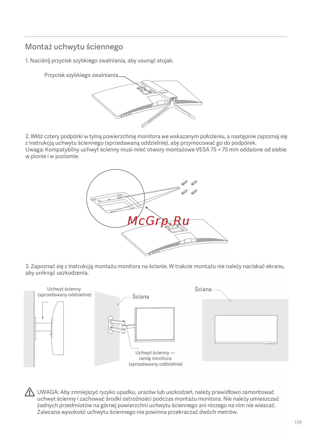 3. Zapoznać się z instrukcją montażu monitora na ścianie. W trakcie montażu nie należy naciskać ekranu,