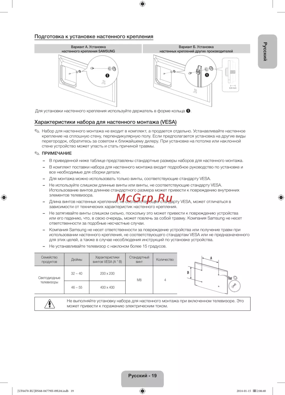 - Установка телевизора на стену с помощью набора для настенного монтажа дополнительно p.18