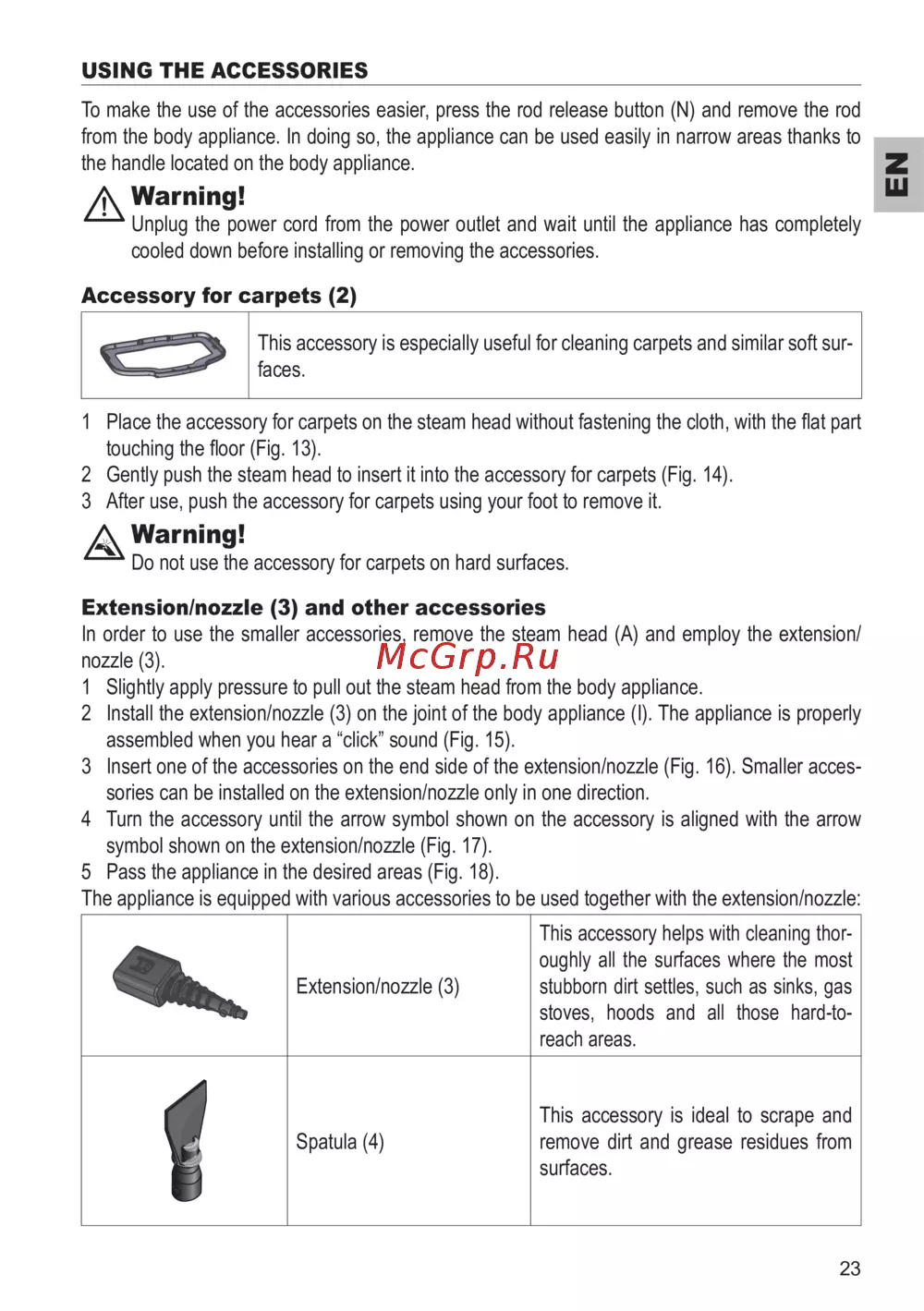 2 Gently push the steam head to insert it into the accessory for carpets (Fig. 14).