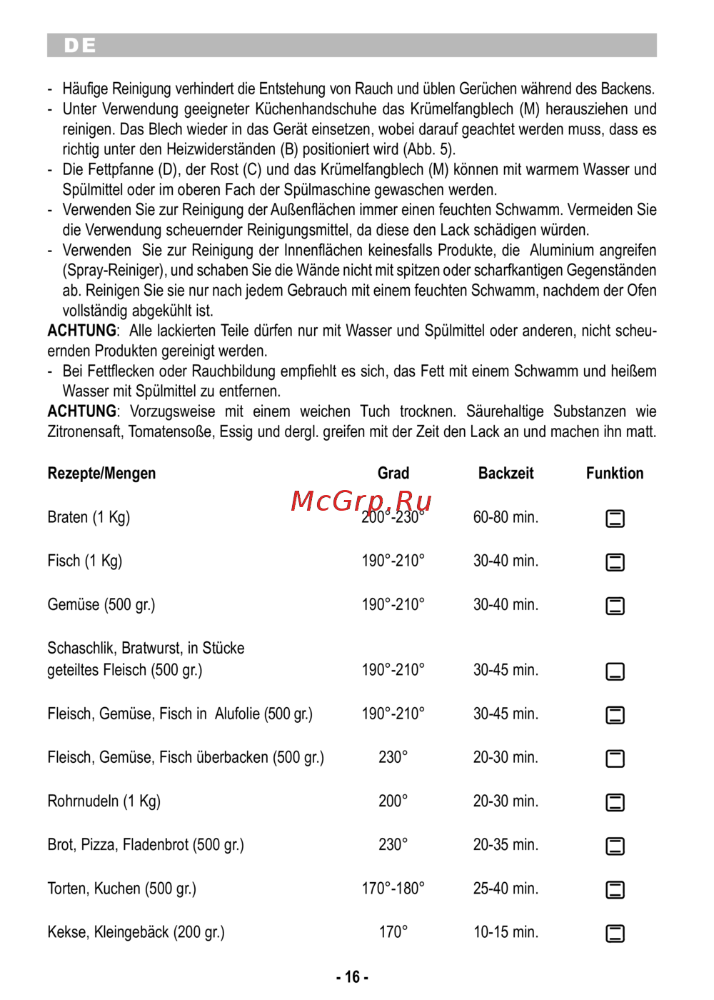 Rezepte/Mengen Grad Backzeit Funktion