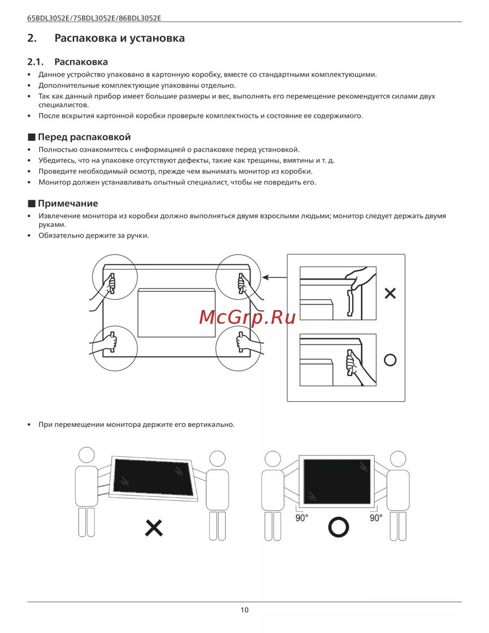 • Извлечение монитора из коробки должно выполняться двумя взрослыми людьми; монитор следует держать двумя