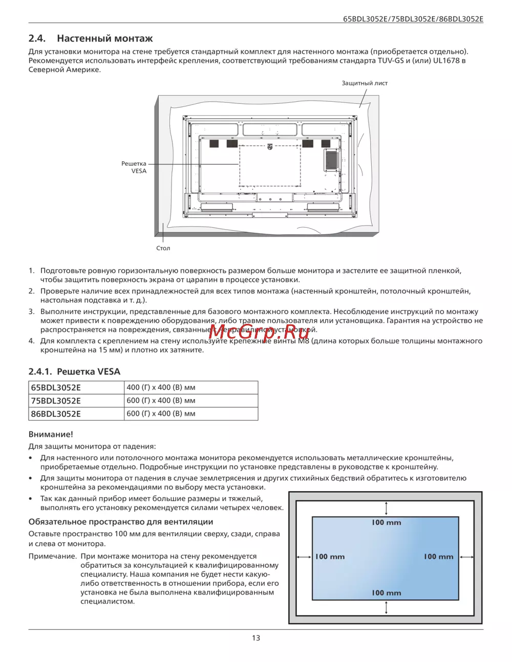 Для установки монитора на стене требуется стандартный комплект для настенного монтажа (приобретается отдельно).