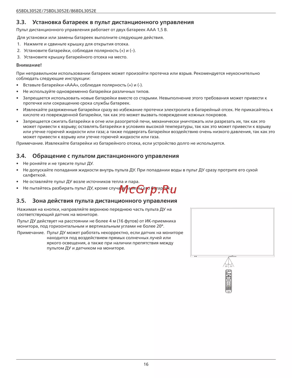 3.5. Зона действия пульта дистанционного управления