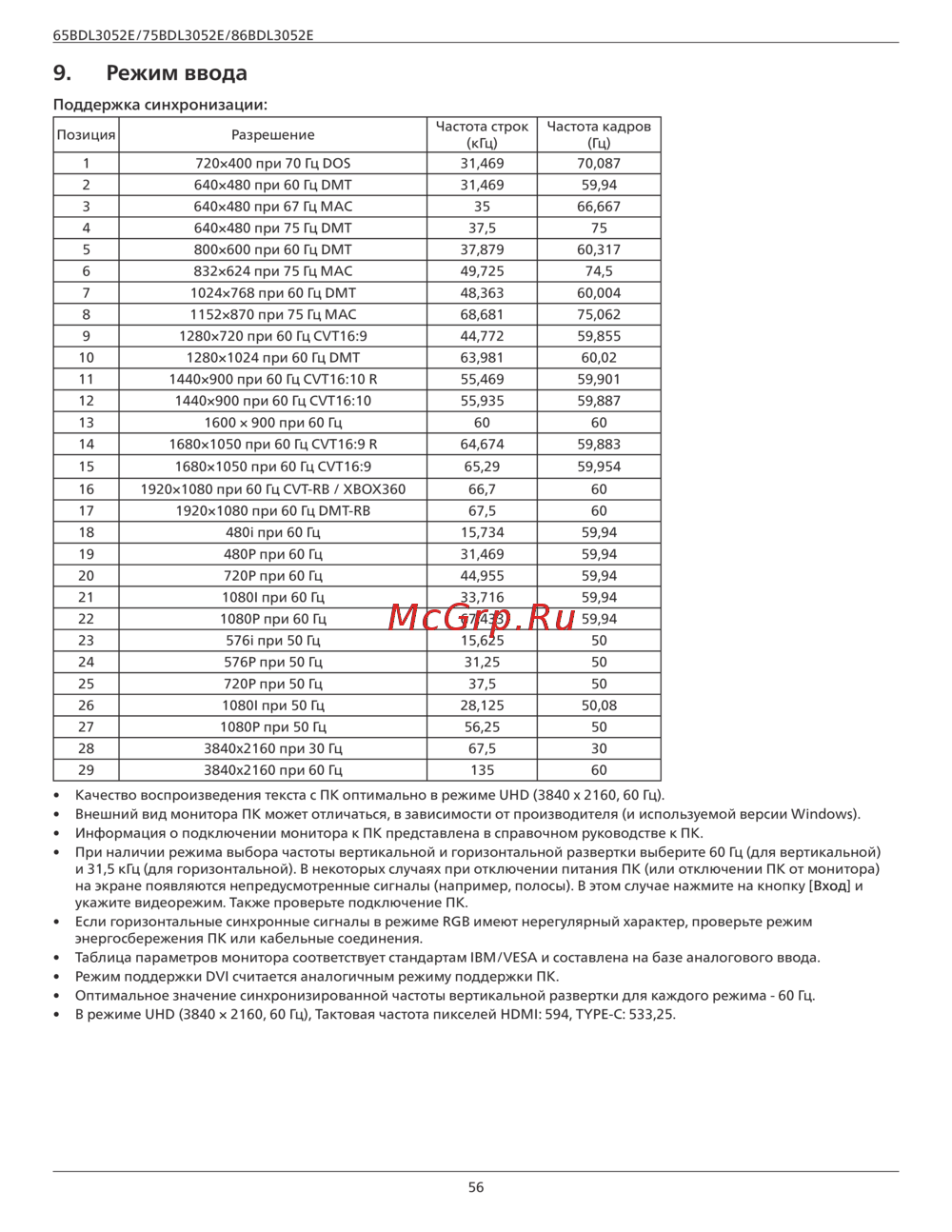 • Режим поддержки DVI считается аналогичным режиму поддержки ПК.