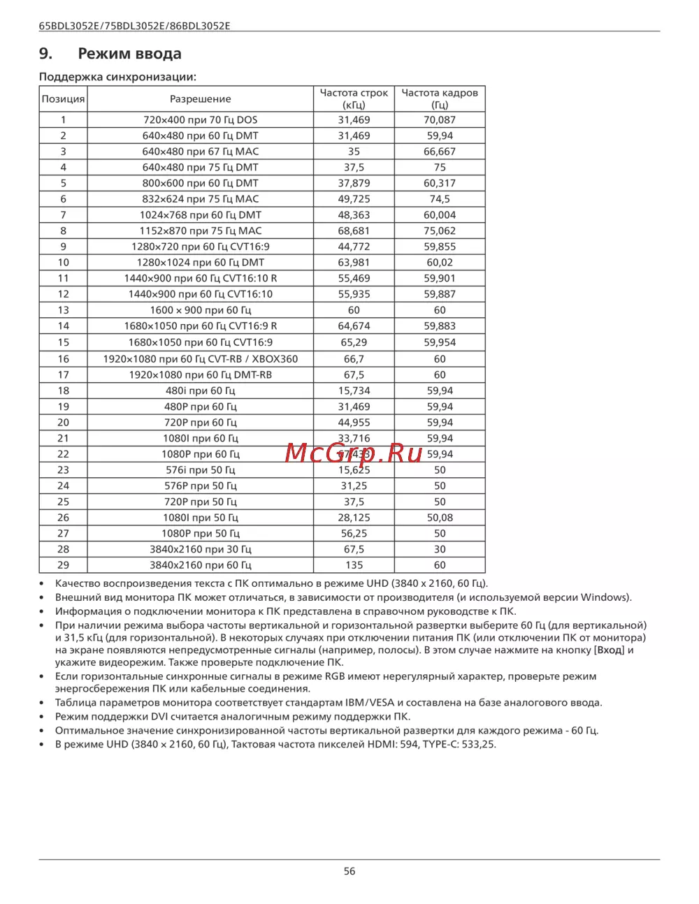 • Оптимальное значение синхронизированной частоты вертикальной развертки для каждого режима - 60 Гц.