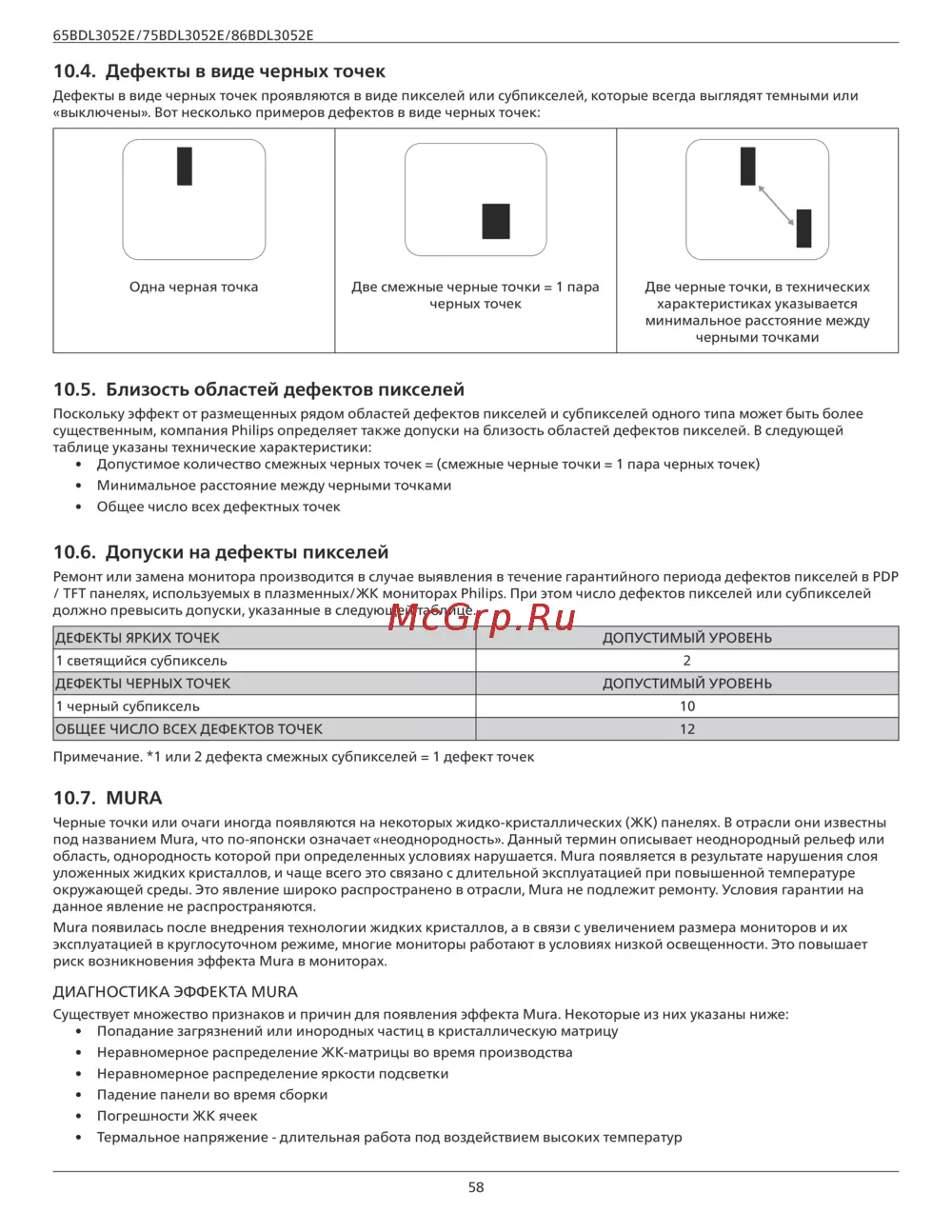 Примечание. *1 или 2 дефекта смежных субпикселей = 1 дефект точек