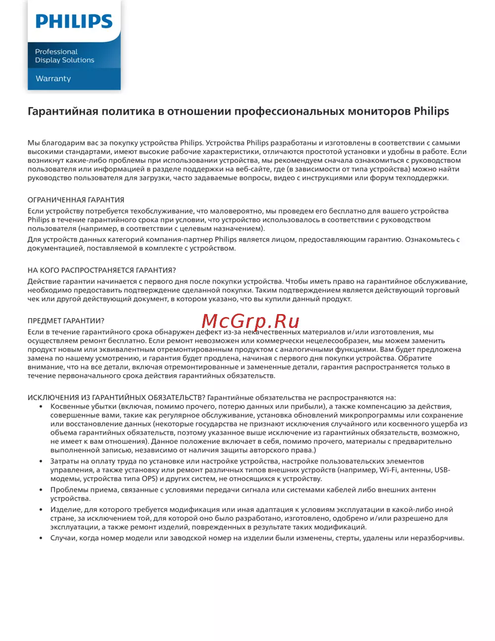 - Гарантийная политика в отношении профессиональных мониторов philips p.67