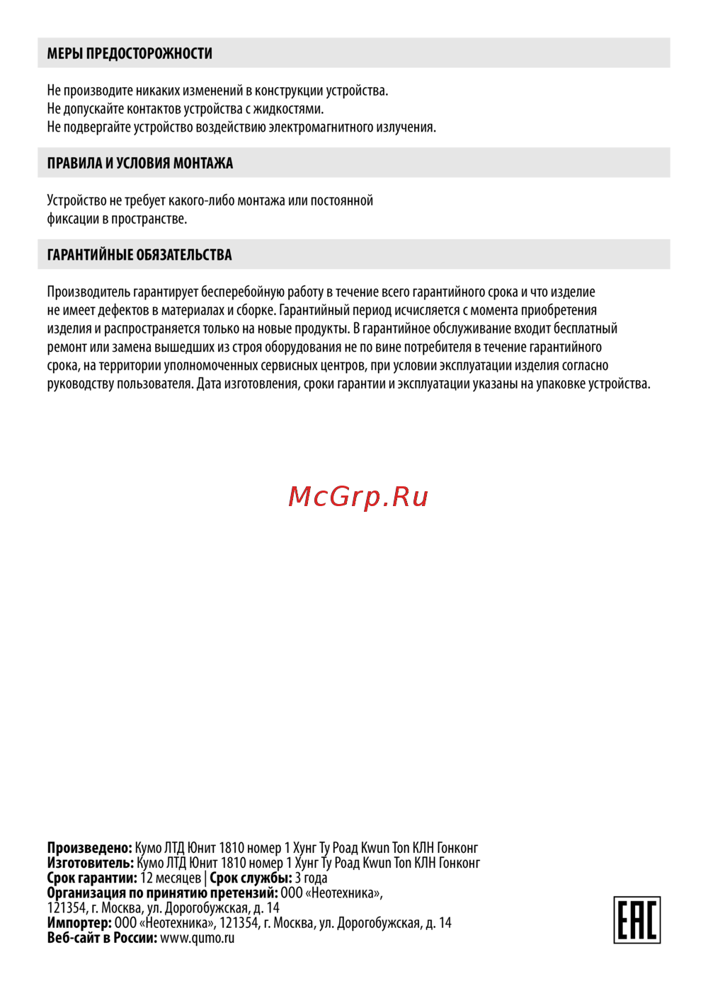 Импортер: ООО «Неотехника», 121354, г. Москва, ул. Дорогобужская, д. 14