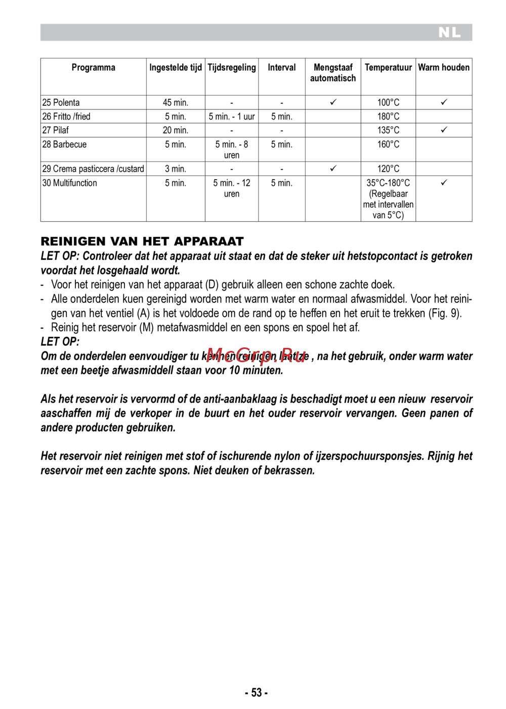 - Temperatuur en tijdsinterval vor ieder programma p.54
