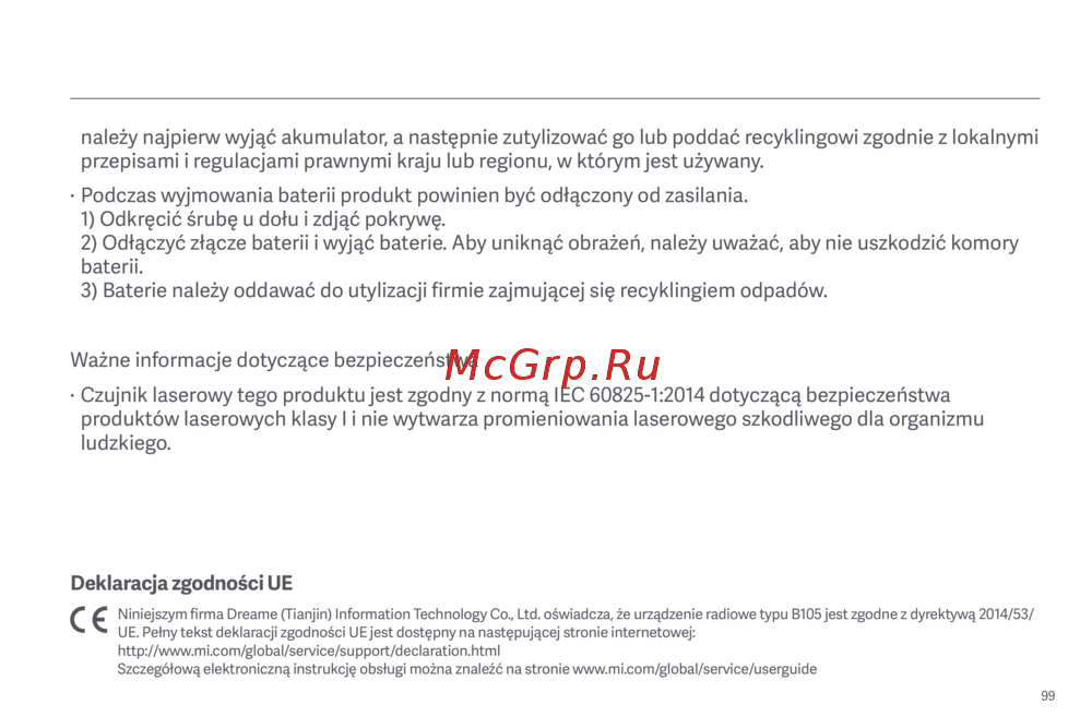 Niniejszym firma Dreame (Tianjin) Information Technology Co., Ltd. oświadcza, że urządzenie radiowe typu B105 jest zgodne z dyrektywą 2014/53/