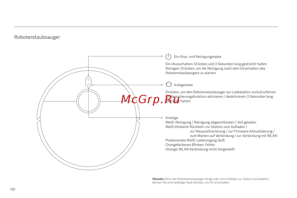 Hinweis: Wenn der Roboterstaubsauger reinigt oder zum Aufladen zur Station zurückkehrt,