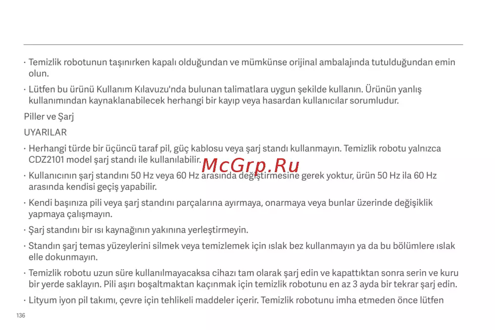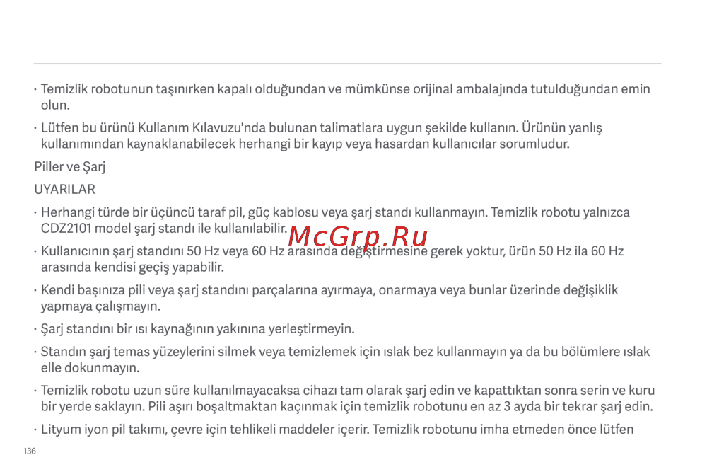 bir yerde saklayın. Pili aşırı boşaltmaktan kaçınmak için temizlik robotunu en az 3 ayda bir tekrar şarj edin.