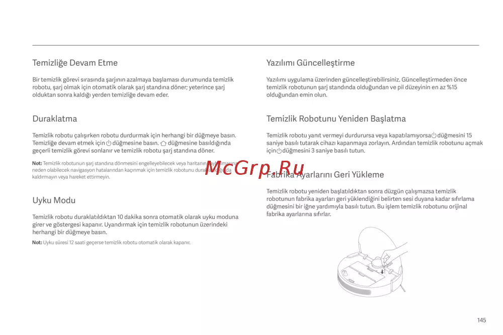 Temizlik robotunuzun otomatik şarj, uyku modu ve fabrika ayarlarına geri yükleme işlemleri hakkında bilgi edinin. Temizlik görevlerinizi kolaylaştırın.