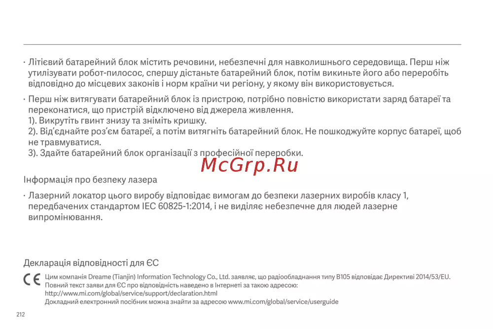 Xiaomi Robot Vacuum S10+ EU — правила утилізації літієвих батарей та безпеки лазера [216/309]