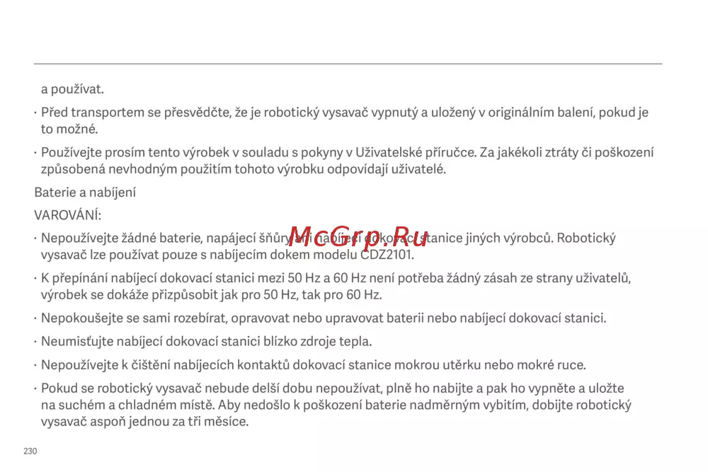 Nepoužívejte žádné baterie, napájecí šňůry ani nabíjecí dokovací stanice jiných výrobců. Robotický