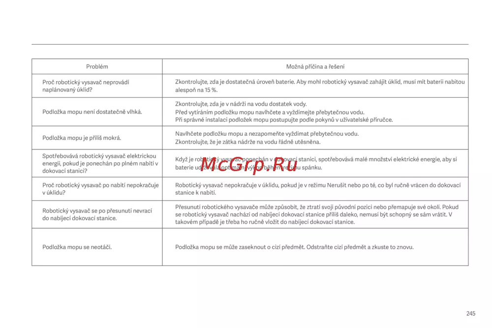 se robotický vysavač nachází od nabíjecí dokovací stanice příliš daleko, nemusí být schopný se sám vrátit. V