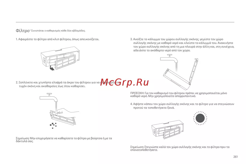 Σημείωση: Μην επιχειρήσετε να καθαρίσετε το φίλτρο με βούρτσα ή με τα