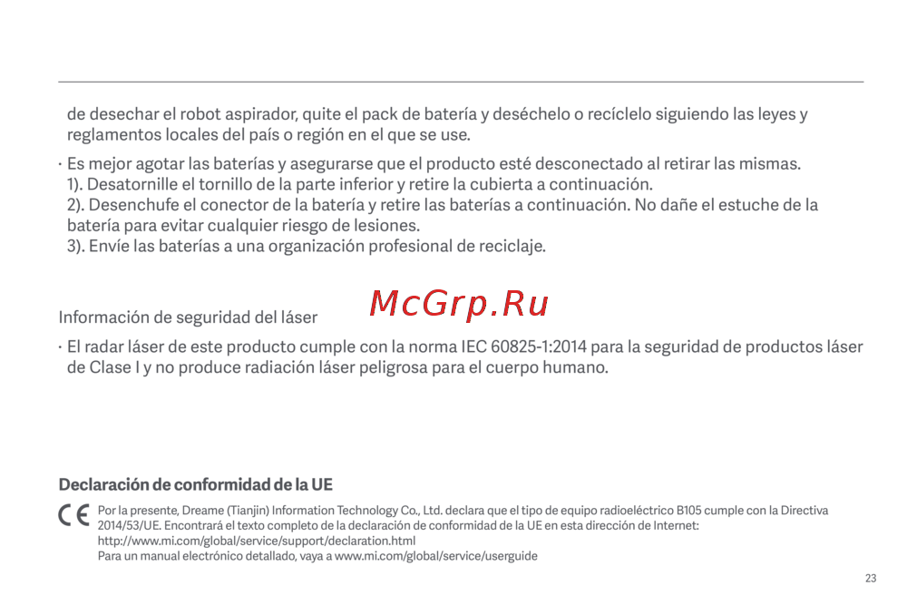 Por la presente, Dreame (Tianjin) Information Technology Co., Ltd. declara que el tipo de equipo radioeléctrico B105 cumple con la Directiva