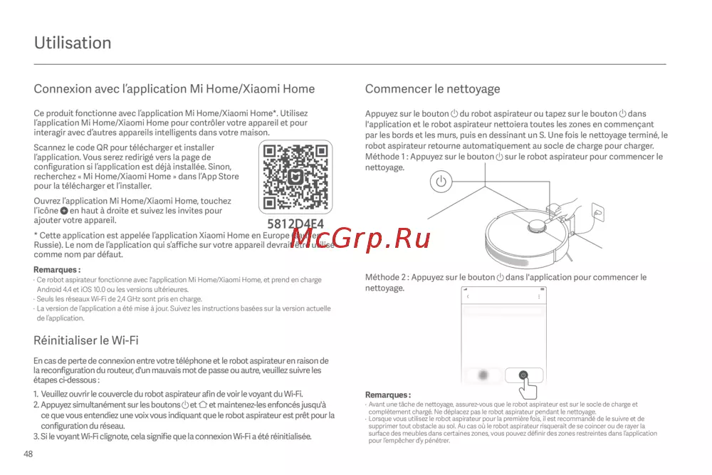 · Ce robot aspirateur fonctionne avec l'application Mi Home/Xiaomi Home, et prend en charge