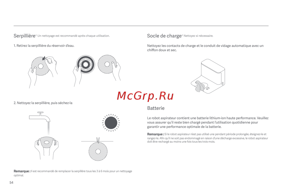 rangez-le. Afin qu’il ne soit pas endommagé en raison d’une décharge excessive, le robot aspirateur