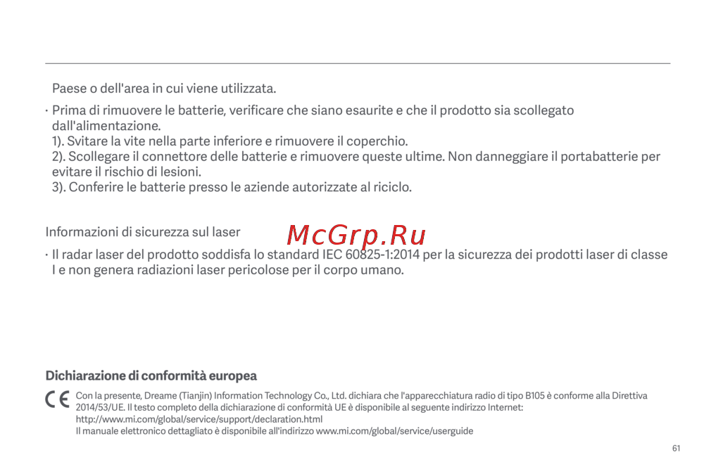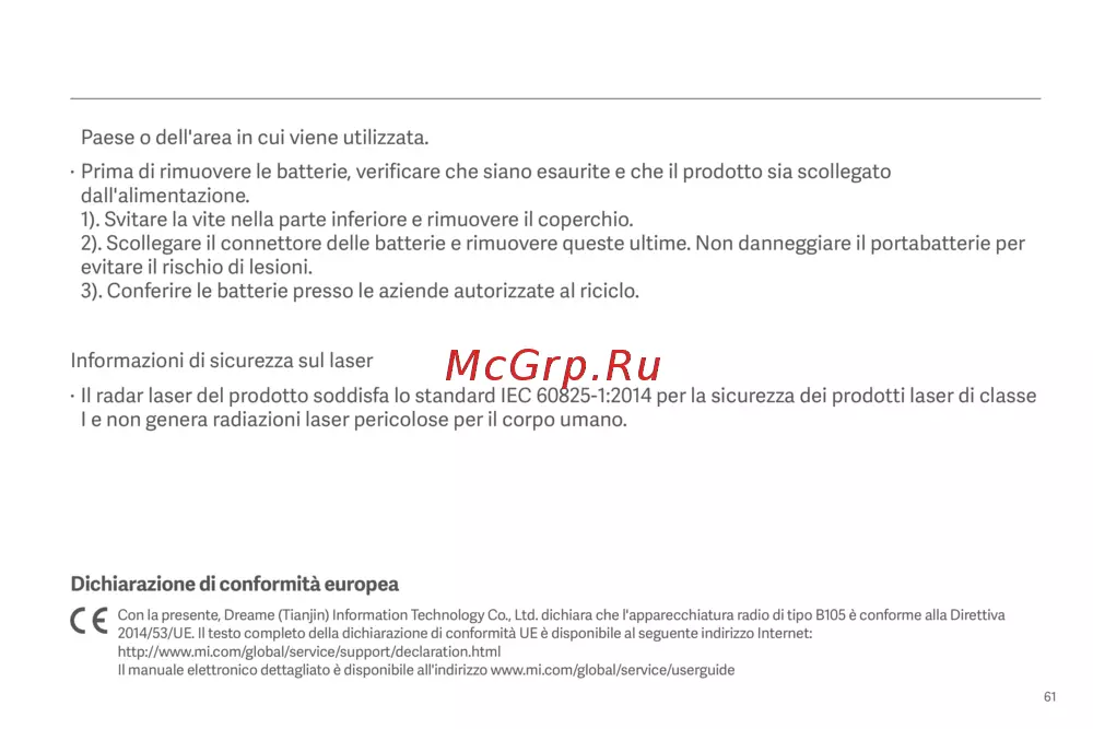 Con la presente, Dreame (Tianjin) Information Technology Co., Ltd. dichiara che l'apparecchiatura radio di tipo B105 è conforme alla Direttiva