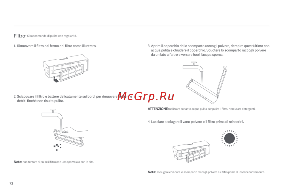 utilizzare soltanto acqua pulita per pulire il filtro. Non usare detergenti.