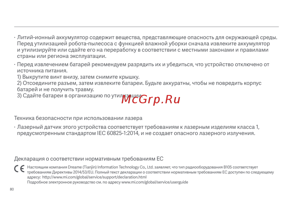 Xiaomi Robot Vacuum S10+ EU — правила утилизации литий-ионных аккумуляторов и безопасность лазеров [84/309]
