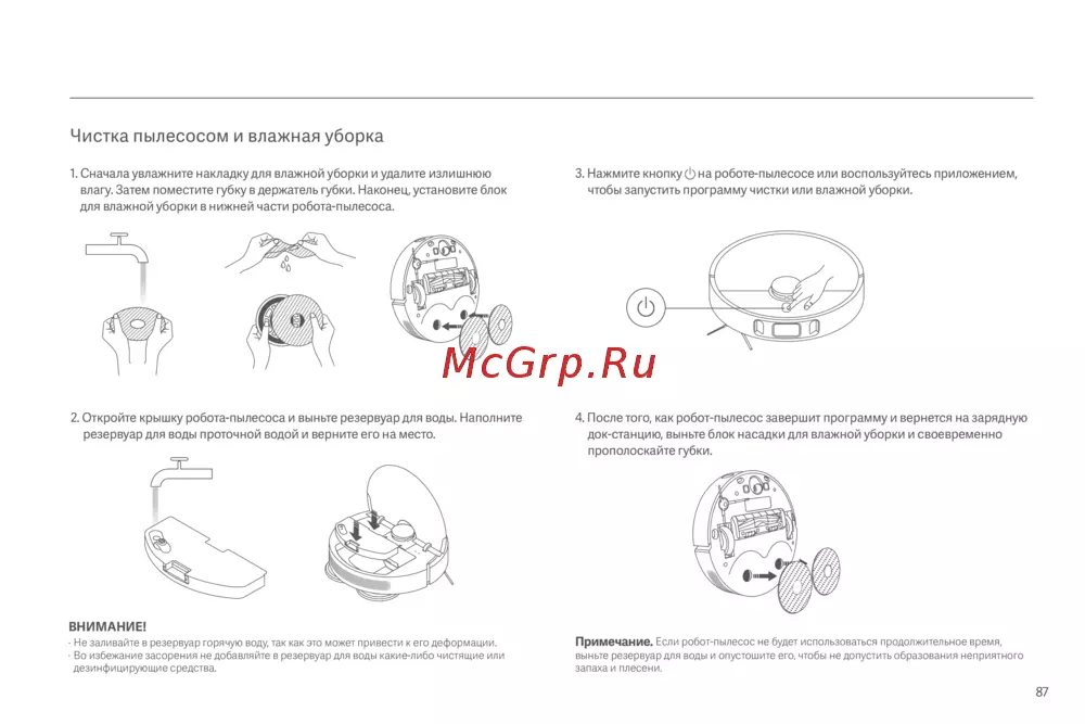 док-станцию, выньте блок насадки для влажной уборки и своевременно