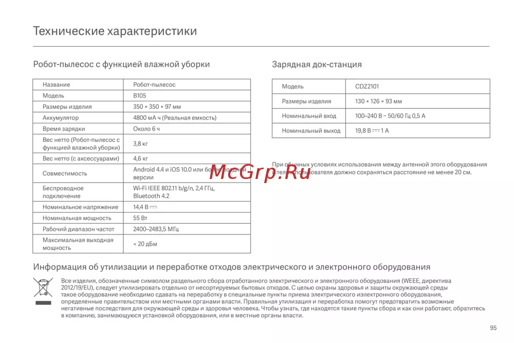 Узнайте о технических характеристиках робот-пылесоса с функцией влажной уборки, включая размеры, аккумулятор, время зарядки и советы по утилизации.
