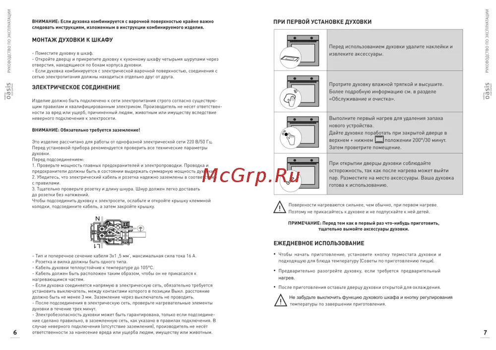 - Выполните первый нагрев для удаления запаха нового устройства дайте духовке поработать при закрытой дверце в верхнем нижнем положении 200 30 минут затем проветрите помещение p.5