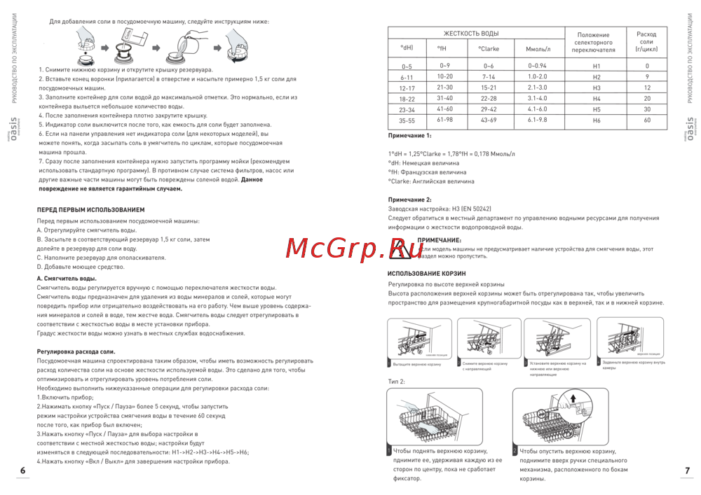 - Отрегулируйте жесткость воды 2 загрузите соль в контейнер для смягчителя 3 загрузите посуду в корзины 4 добавьте моющее средство и ополаскиватель в диспенсер p.4
