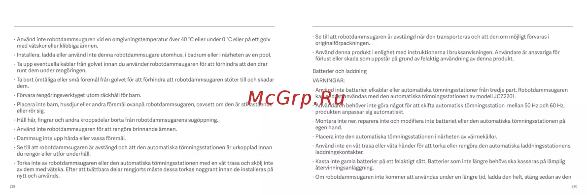 - Litiumjonbatteripaketet innehåller ämnen som är skadliga för miljön innan du kasserar robotdammsugaren ska du först ta bort batteripaketet och sedan kasta det eller återvinna det i enlighet med lokala lagar och regler i det land eller den region det används i p.118