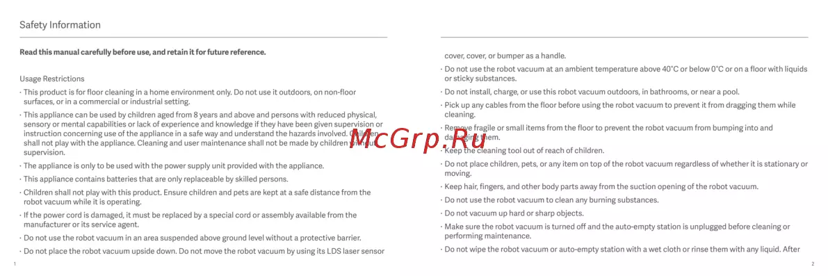 Do not use the robot vacuum at an ambient temperature above 40°C or below 0°C or on a floor with liquids