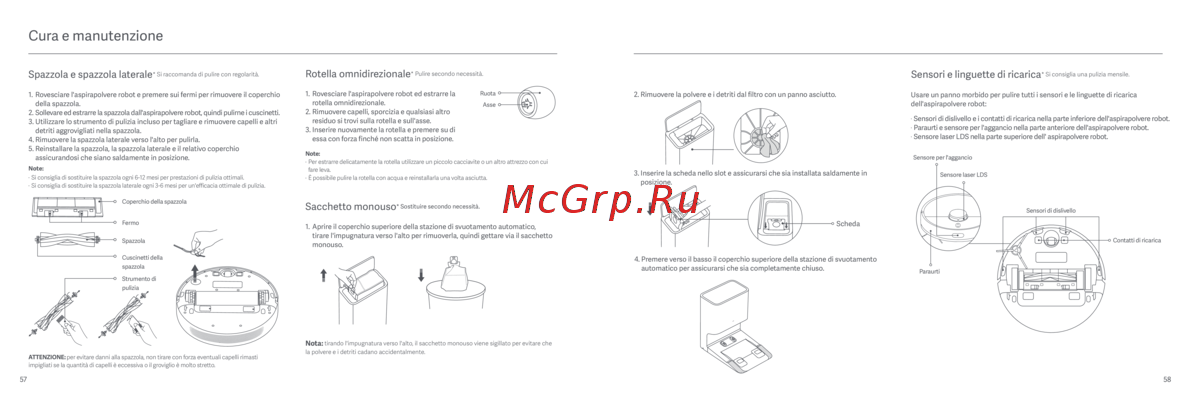 - Vänd robotdammsugaren och nyp klämmorna för att ta bort borstkåpan 2 lyft borsten ur robotdammsugaren och rengör borstlagren 3 använd det särskilda rengöringsverktyget för att klippa bort eventuellt hårtrassel och annat skräp från borsten 4 ta bort sidoborsten genom att dra den uppåt för att rengöra den 5 sätt tillbaka borsten sidoborsten och borsthöljet och se till att de sitter fast ordentligt p.122