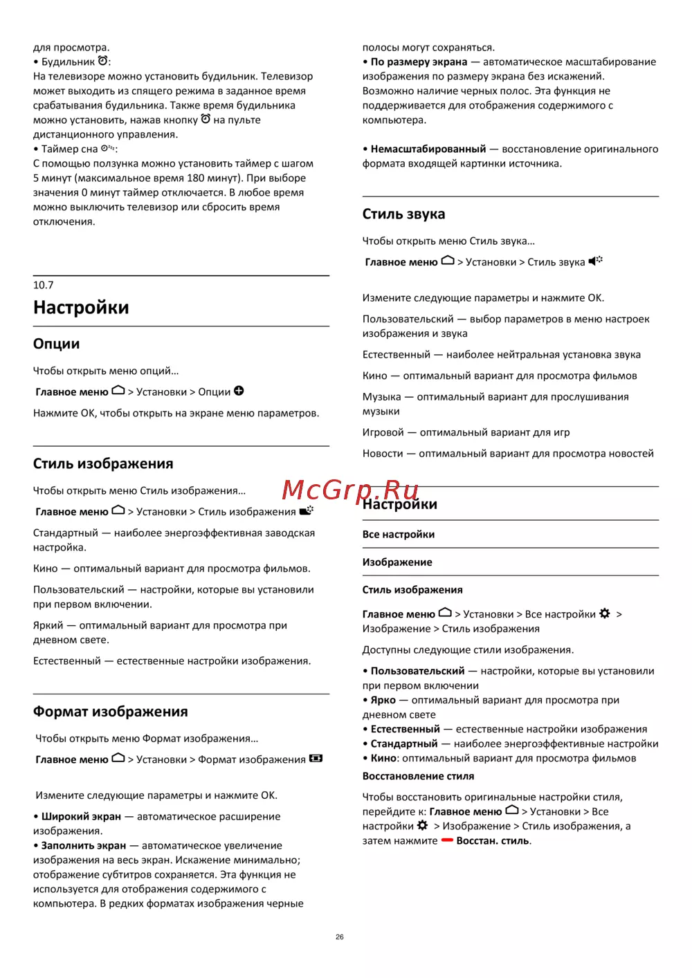 Узнайте, как настроить будильник и таймер сна на телевизоре, а также измените стили изображения и звука для оптимального просмотра и прослушивания.