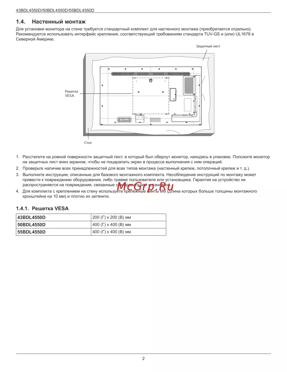 Philips 43BDL4550D/00 — инструкция по настенному монтажу мониторов: советы и рекомендации [14/72]