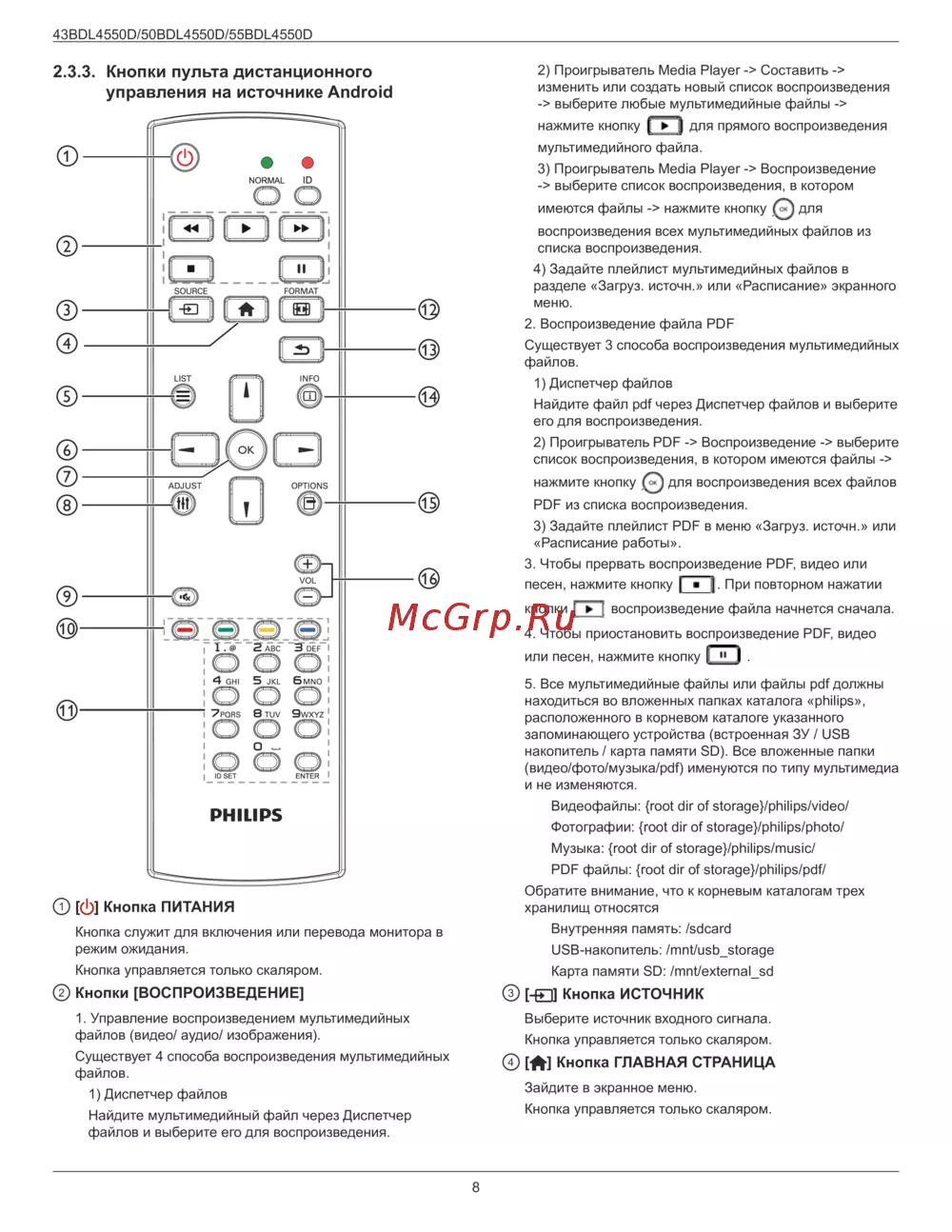 Philips 43BDL4550D/00 — управление мультимедийными файлами и настройками устройства [20/72]