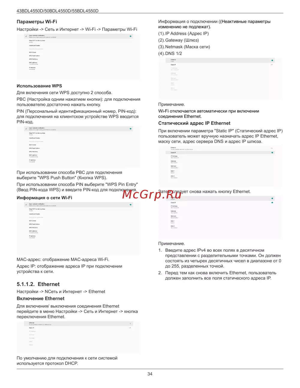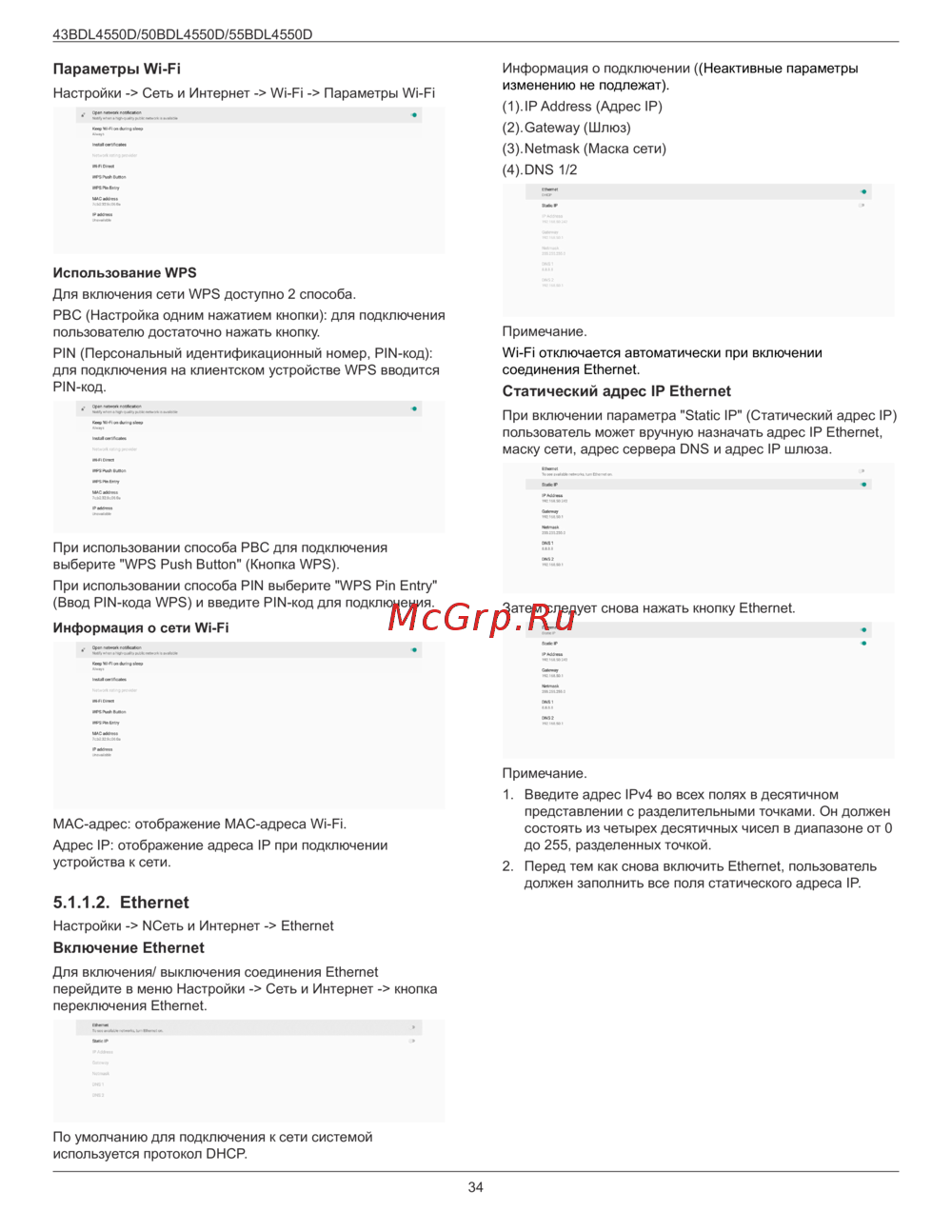 Узнайте, как настроить Wi-Fi и Ethernet, включая использование WPS и статического IP. Подробные инструкции по подключению и управлению сетевыми параметрами.
