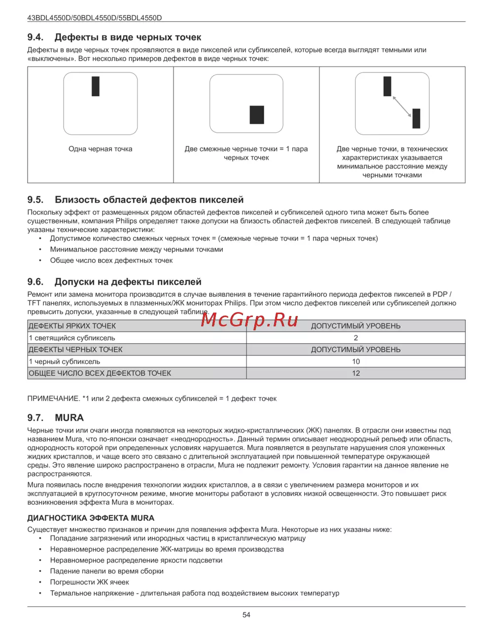 ПРИМЕЧАНИЕ. *1 или 2 дефекта смежных субпикселей = 1 дефект точек
