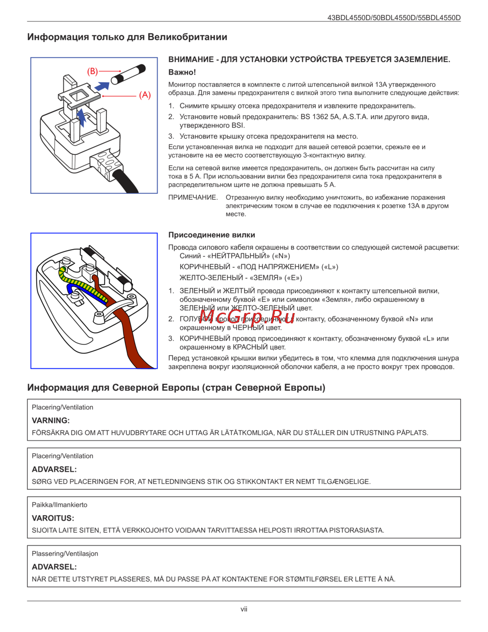 - Перед установкой крышки вилки убедитесь в том что клемма для подключения шнура закреплена вокруг изоляционной оболочки кабеля а не просто вокруг трех проводов p.7