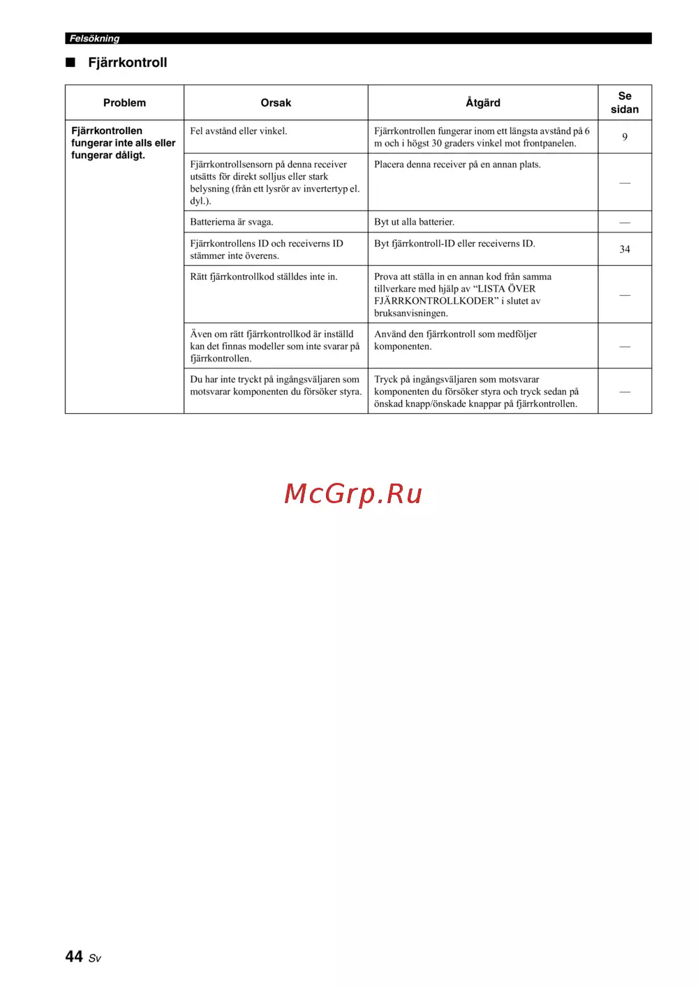 - Если этот аппарат работает неправильно см таблицу ниже в случае если проблема не указана в таблице или проблему не удалось устранить переведите аппарат в режим ожидания отсоедините кабель питания и обратитесь к ближайшему авторизованному дилеру или в сервисный центр yamaha p.392