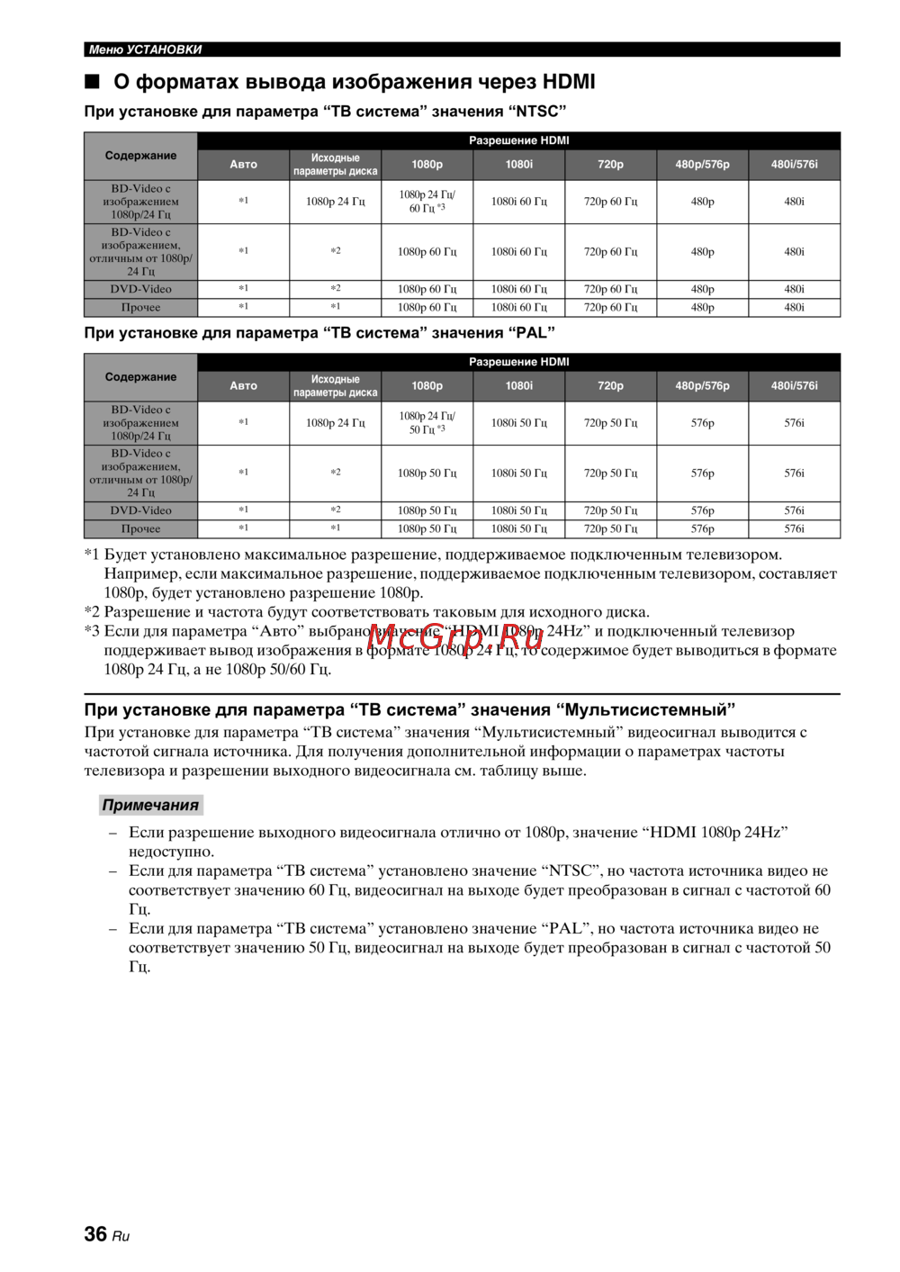- Если разрешение выходного видеосигнала отлично от 1080p значение hdmi 1080p 24hz недоступно если для параметра тв система установлено значение ntsc но частота источника видео не соответствует значению 60 гц видеосигнал на выходе будет преобразован в сигнал с частотой 60 гц если для параметра тв система установлено значение pal но частота источника видео не соответствует значению 50 гц видеосигнал на выходе будет преобразован в сигнал с частотой 50 гц p.38