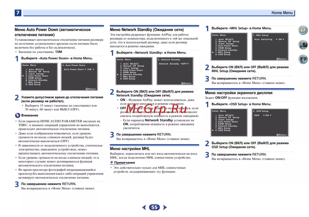 - Для воспроизведения с подключенного к ресиверу mhl совместимого устройства на телевизоре который также подключен к ресиверу должно быть включено питание ресивера p.30