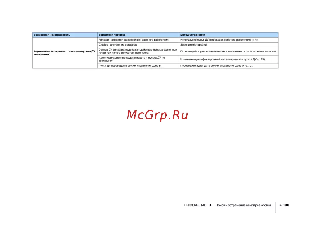 ПРИЛОЖЕНИЕ ➤ Поиск и устранение неисправностей Ru 100