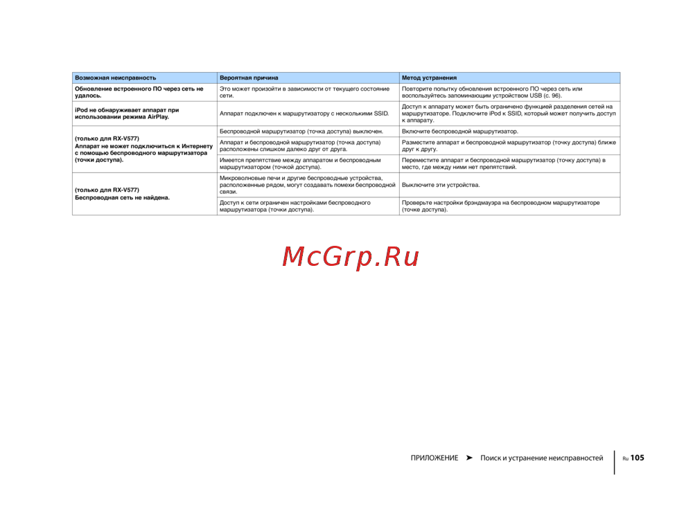 ПРИЛОЖЕНИЕ ➤ Поиск и устранение неисправностей Ru 105