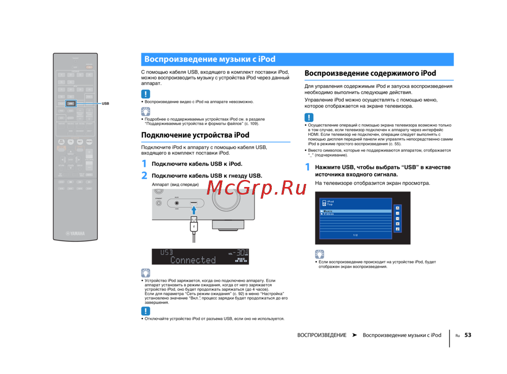ВОСПРОИЗВЕДЕНИЕ ➤ Воспроизведение музыки с iPod Ru 53